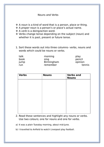 Nouns and Verbs Worksheets | Nouns and verbs worksheets ... These nouns and verbs worksheets are perfect for Kinder and First Grade classrooms! They are hands on and engaging and have a variety of ways to teach skills. You can use them in your literacy centers, interactive notebooks, small groups, morning work, send it as h... Jun 1, 2018 - Back to school nouns and verbs.